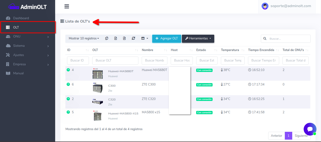 Nos saldrán las ONU's que tenemos en la AdminOLT, y podremos exportarlas a la OLT
