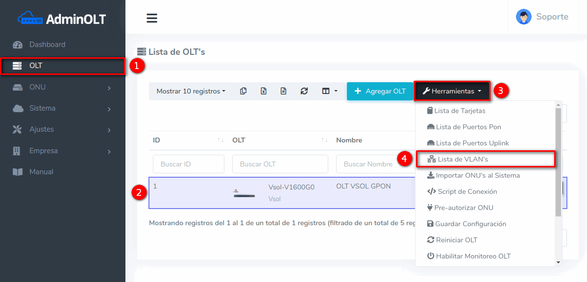 2 Después de agregar esta vlan en tu router, podremos agregarla en la OLT desde la Lista de OLT's seleccionando la OLT y la opción Lista de VLAN's.