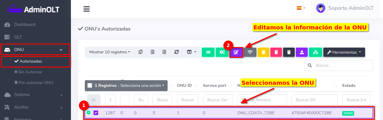 Pasos para editar información de ONU Autorizada por SN